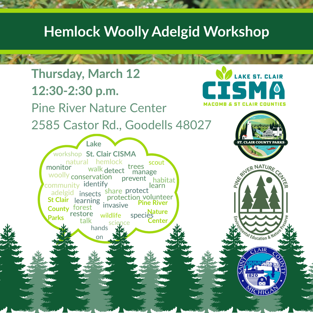 Join the Lake St. Clair Cooperative Invasive Species Management Area (CISMA), Pine River Nature Center, and St. Clair County Parks and Recreation Commission for a Hemlock Woolly Adelgid (HWA) Workshop this spring! Hemlock Woolly Adelgid is an invasive insect that feeds on Eastern Hemlock trees, which are native to Michigan and are also used in landscaping. HWA is a watch list invasive species, which are those that are not yet found in the state or found in limited abundance or small areas.